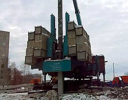 При работе на сваевдавливающей установке копер уже не нужен. Обычно на ней уже установлен небольшой кран для подачи свай. Сваи подаются в специальный зажим, расположенный по центру установки. Усилия, прикладываемые к свае огромны. Для того чтобы она не перевернулась нужны отвесы. При этом вес такой самоходной установки становится очень большим.