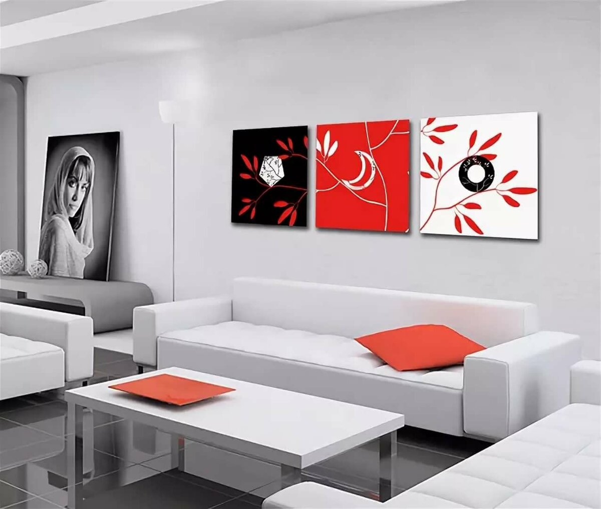 Для украшения гостиной картинами, рекомендуется использовать коллаж из полотен. Это могут быть совершенно разные картины, связанные цветовой гаммой или модульный вариант. Так же прекрасный акцент помогут сделать картины-портреты с любимыми звёздами, актерами или певцами (наиболее популярные в черно-белом цвете).