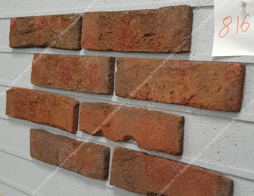 Для имитации кирпичной кладки выпускается плитка, формат которой приблизительно равен размерам боковой поверхности красного кирпича – 250 х 55 мм. Художественное исполнение изделия может быть разнообразным – от имитации нового кирпича до почти полного сходства с состарившимся, потерявшим первоначальную геометрию материалом.