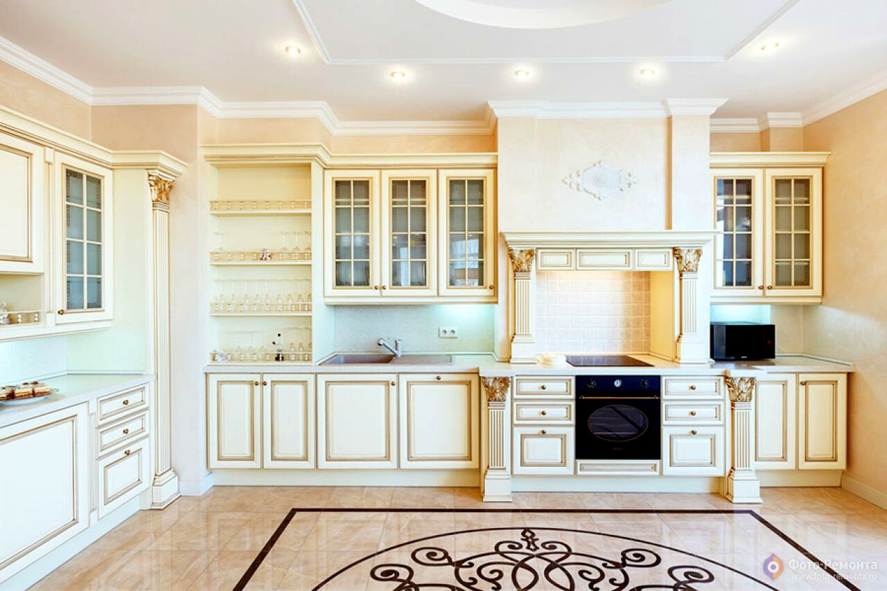 - Не менее популярной является бежевая кухня. Ее также можно оттенить более темной столешницей или позолотой на деталях: патина или золоченая краска покрывает ручки, фасады, молдинги, лепку под потолком.