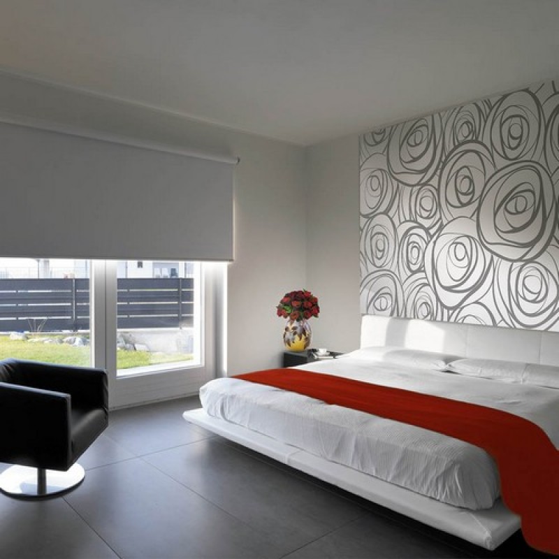 Для максимально интересного оформления спальной можно воспользоваться обоями с различными принтами. В небольших помещения стоит отдать предпочтение вертикальным рисункам, так как их использование позволит визуально расширить комнату и увеличить длину стен.