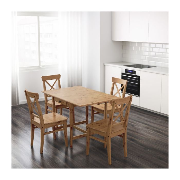 Материал, из которого изготовлена мебель IKEA для столовой — это высококачественный прочный и безопасный пластик в сочетании с металлом, или же натуральное дерево.