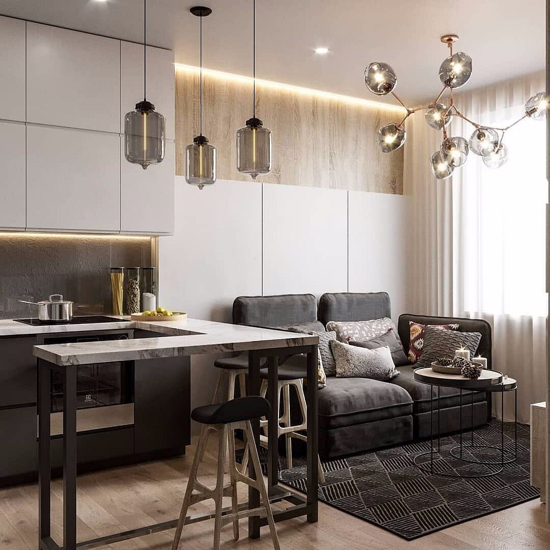 В оформлении стен, пола и потолка стоит отдавать предпочтение гладким материалам светлого цвета, а при меблировке – компактным и функциональным предметам. Выбор одного из современных стилистических решений позволит сделать интерьер небольшой кухни-гостиной изысканным и уютным.