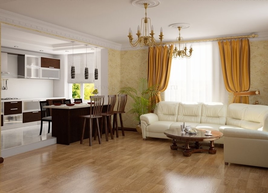 Тогда важно подобрать гармоничные шторы, осветительные группы и другие декоративные детали. Здесь, конечно, нет острова и различий в отделке поверхностей.