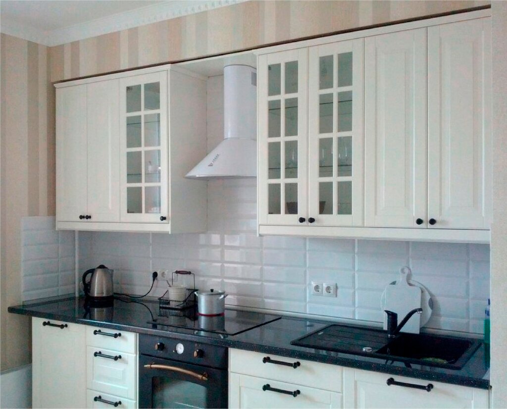 Светлые фасады стильно сочетаются с контрастными деталями интерьера. Присутствуют стеклянные и сплошные навесные дверцы.