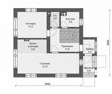 В одноэтажном квадратном доме 8,5х8,5 метров можно разместить три жилые комнаты, ванную, кухню и туалет. Кроме этого, здесь можно расположить тамбур и дополнительное помещение с небольшой котельной.