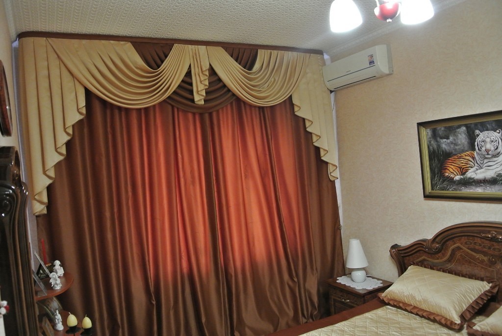 На фото интерьер спальни с асимметричными ламбрекенами на окнах.