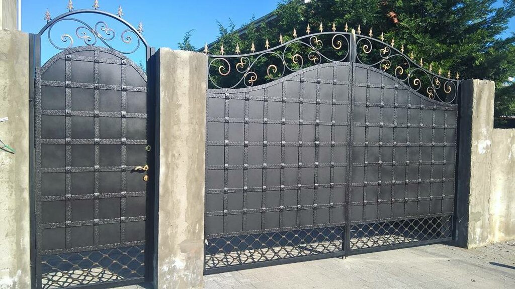 Могут быть и со встроенной в одну из створок калиткой, это экономит пространство в небольших помещениях (гаражах, небольших территориях).
