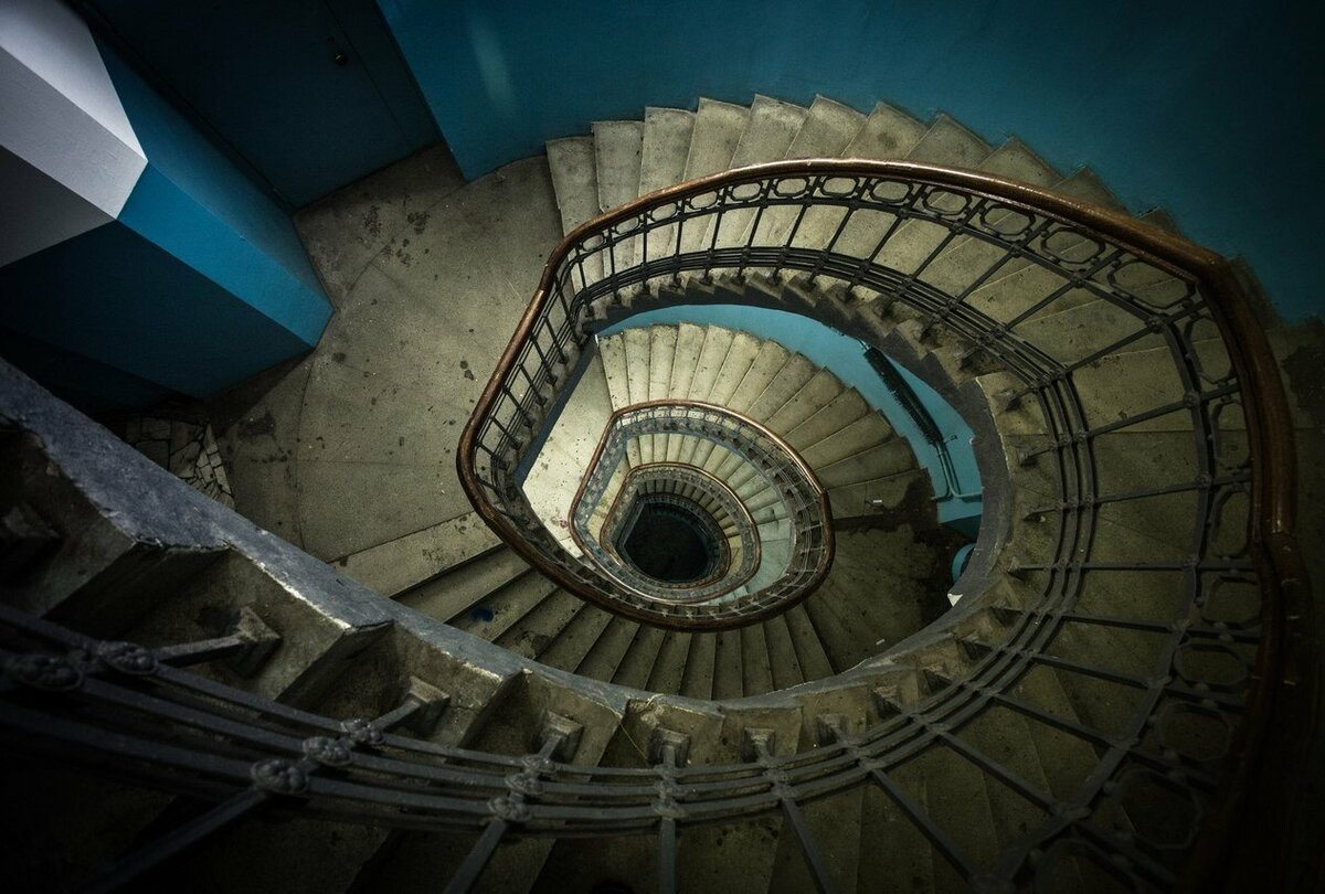 Древняя лестница многоэтажного дома. Прямо вверху. Фотография, картинки, изображения и сток-фотография без роялти. Изображение 130062240.Старинная лестница многоэтажного дома.Прямо вверху.
