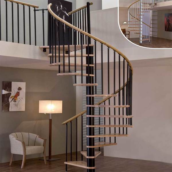 Совет! Винтовая деревянная лестница на металлическом каркасе как нельзя лучше подходит для домов с небольшой площадью комнат. Однако следует учитывать, что частые подъемы по ней могут оказаться утомительными, а перемещение мебели с этажа на этаж – достаточно трудоемким.