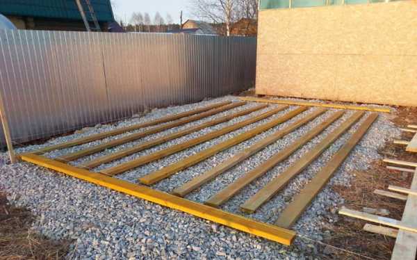 Лаги обработали защитной пропиткой.Мы приняли решение обойтись без фундамента и приступили к строительству пола прямо на грунте, который был выровнен с помощью гравия. Это первая и основная ошибка, когда мы начали строить недорогой каркасный домик.