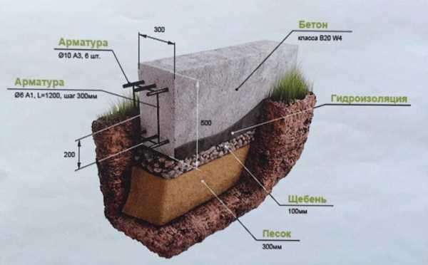 - Под кирпичный дом придётся выполнить заглублённый монолитный ленточный фундамент из железобетона. Это самый дорогой вариант обустройства основания. Глубина заложения подошвы фундамента должна быть ниже точки промерзания грунта.