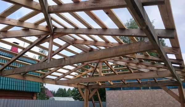 - Устанавливаем стропильные ноги (доски) в единую стропильную систему, напоминающую русскую букву «Λ». Делать это лучше всего из брусьев 15 на 10 см. Чтоб конструкция была крепче, каждую букву соединяем поперечиной (растяжкой), чтобы получилась буква «А». Стропила закрепляют через каждый метр, начиная от края.