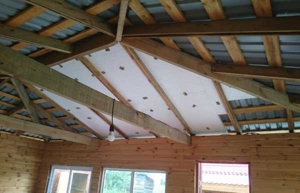 - Далее гвоздями крепим стойки перпендикулярно стропилам, делаем это по всей длине нашей крыши. Нужно следить, чтоб стойки выступали по обеим сторонам на 30 сантиметров, с шагом в 10 сантиметров.