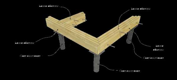 - Далее на столбы укладываются балки обвязки (брус 150х15 мм). В углах они скрепляются между собой и фиксируются к столбам при помощи анкеров или стальных скоб.