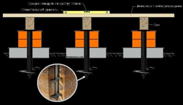 Итак, все чертежные работы выполнены, место для строительства выбрано — начинаем возводить фундамент. Так как строение будет иметь небольшой вес, основание под него можно выбрать самое простое, а именно — столбчатый фундамент на винтовых сваях.