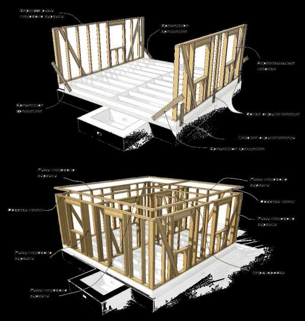 - Далее монтируем каркас стен. Его можно собрать на земле и поднять на балку или возводить прямо на обвязке. Второй вариант больше подходит для самостоятельного выполнения. Для каркаса стоит взять бруски сечением 50х150 мм. В углах дома для повышения жёсткости устанавливаются сдвоенные бруски.