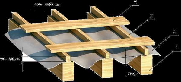 Схема устройства кровельного пирога: 1 — стропильная нога, 2 — пароизоляция, 3 — контробрешетка, 4 — обрешетка