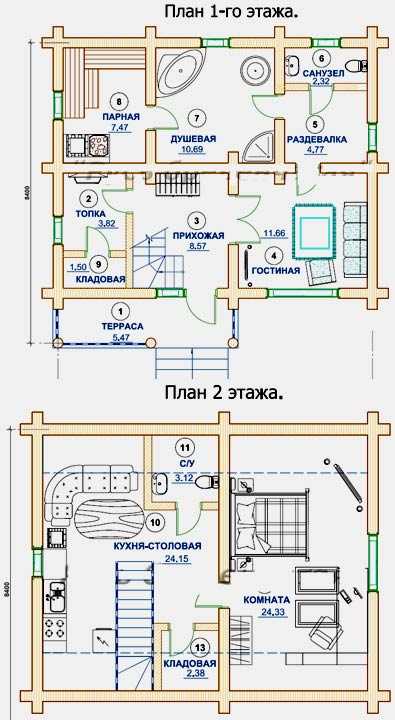Проект двухэтажного гостевого домика с планировками двух этажей совмещённого с баней