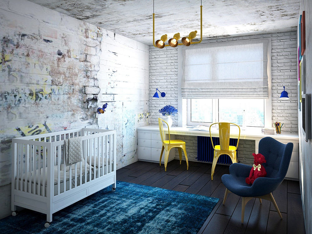 Лофт чудесно подходит для детской/подростковой творческой натуры. Современная кровать-подиум будет хорошо гармонизировать с деревянным состаренным мольбертом, большими пуфами, настенной имитацией балок, а также с декором в виде афиш музыкальных групп, рисунков и эксклюзивных игрушек ручной работы.