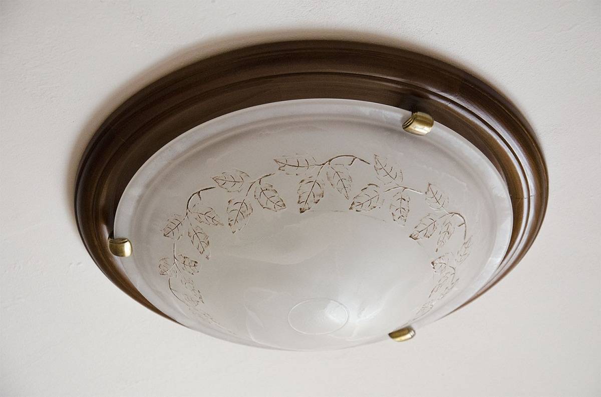 - Светильник-тарелка представляет собой цельный стеклянный плафон в виде круга, овала, квадрата или более сложной формы, над которым расположены две или более лампы. Учитывая, что работа ламп нагревает пленку, а расстояние их от потолка минимальное, в люстрах-тарелках необходимо использовать энергосберегающие люминесцентные лампы или светодиодные.