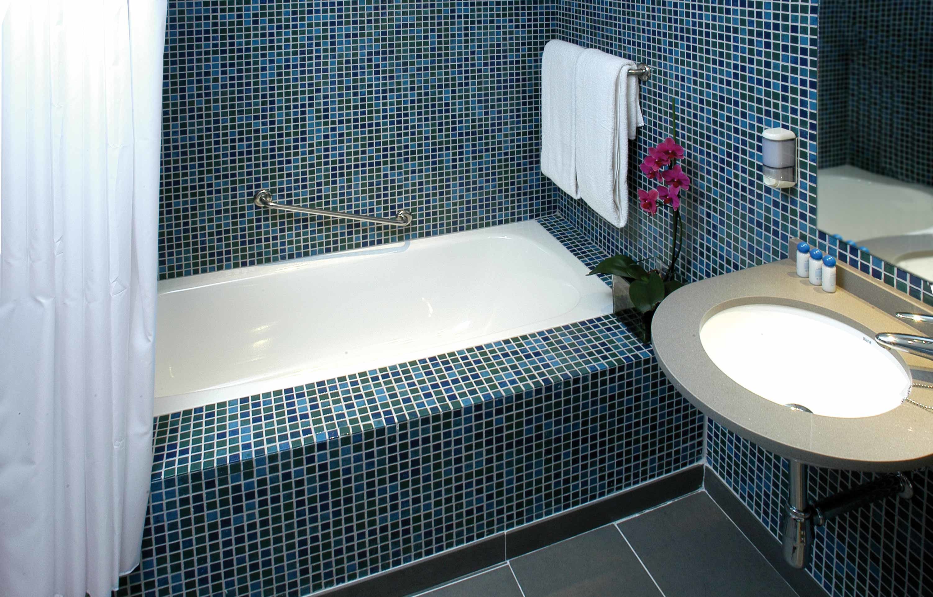 Клей наносят на плитку ровным слоем, ровняют зубатым шпателем и сразу удаляют излишки клея после наклеивания. После оклейки ванной мозаикой нужно подождать сутки, а затем сделать затирку швов. Выбирайте эпоксидную затирку, так как она влагостойкая.