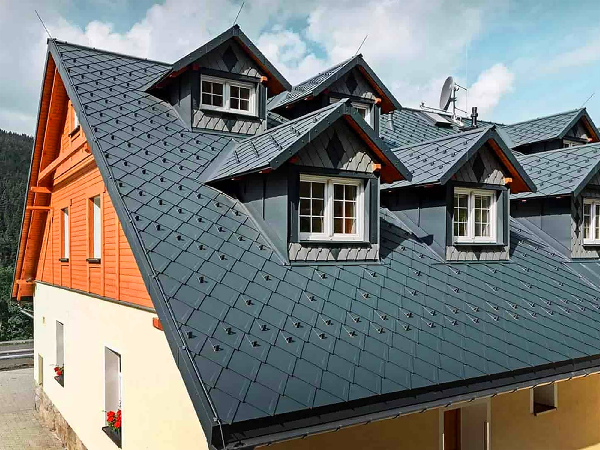 Благодаря высоким эстетическим характеристикам материал гармонично сочетается с отделкой фасада любого вида, будь то сайдинг, штукатурка, кирпич или дерево.