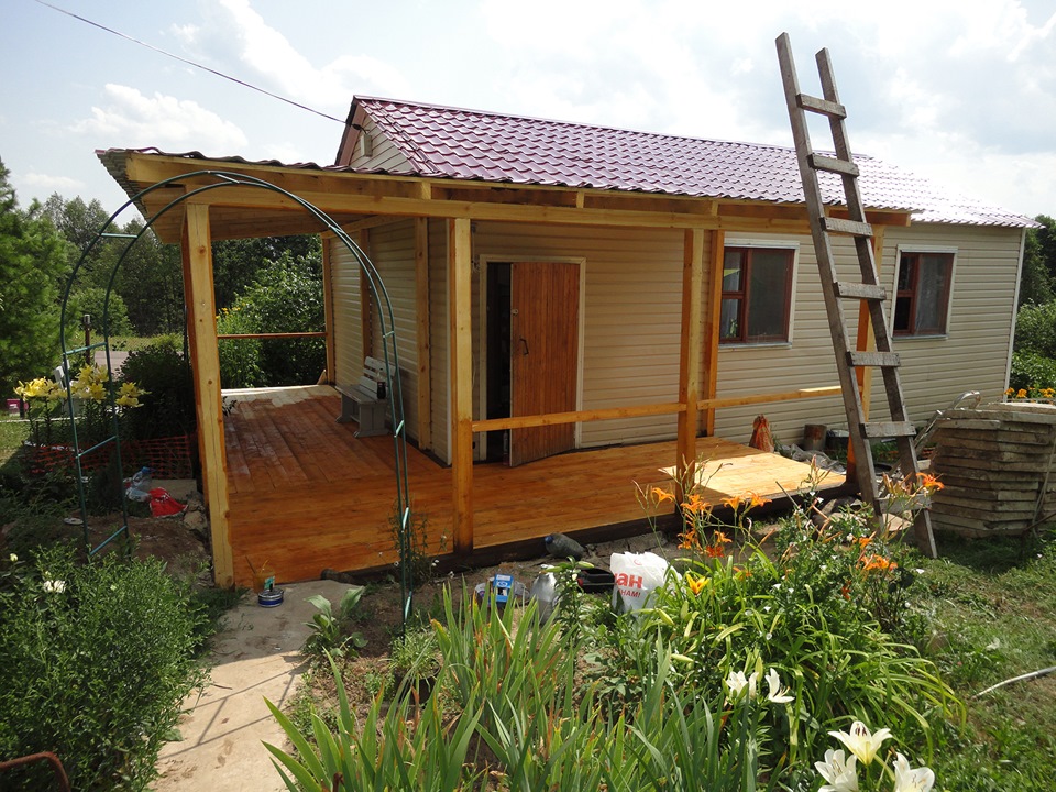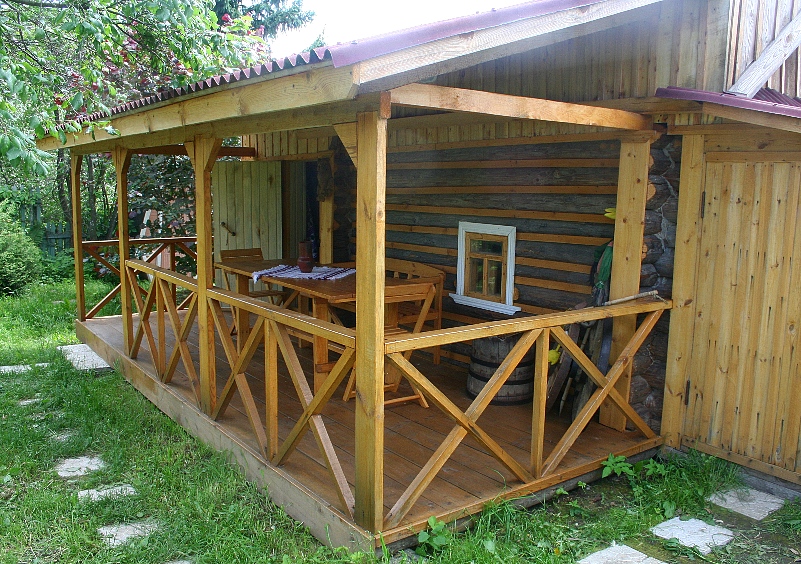 Самая простая пристройка – открытая, частично или полностью укрытая навесом на стойках. На такой палубе можно отдохнуть после парной, расслабиться в теплую летнюю погоду, и конечно, отдать должное послебанному ритуалу – чаепитию.