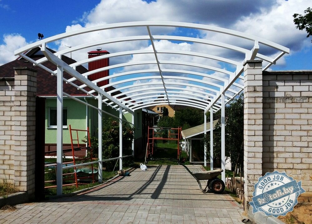 Это самый доступный на сегодняшний день материал, из которого монтируется навес для автомобиля. Его известные достоинства — легкость, долговечность, устойчивость к воздействию природных факторов. Кроме того, он обладает прекрасными эстетическими качествами, превращающими навес в элемент ландшафтного дизайна.