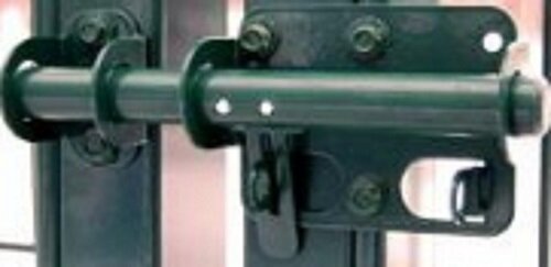 Замок скользящей задвижки — это простое устройство, которое работает, вставляя задвижку, прикрепленную к воротам, в скобу, которая была приварена или прикреплена к стойке ворот. Этот тип защелки обычно располагается внутри ворот таким образом, чтобы до них нельзя было добраться снаружи. Некоторые конструкции боковых засовов могут быть заблокированы навесным замком для дополнительной безопасности.