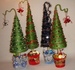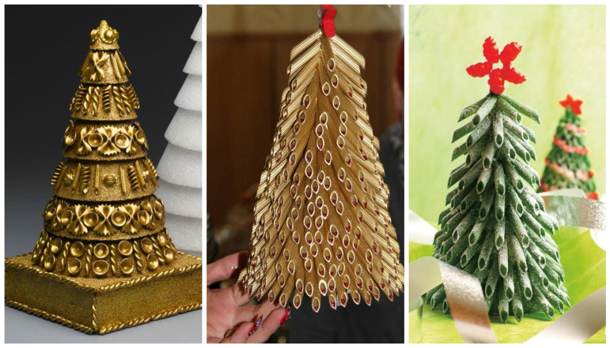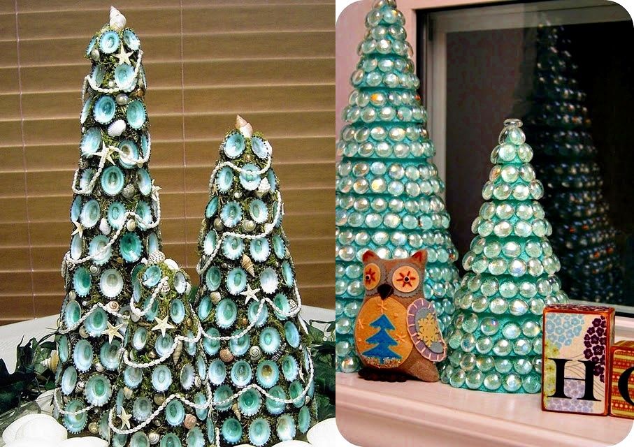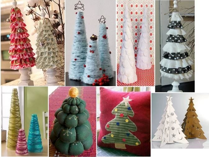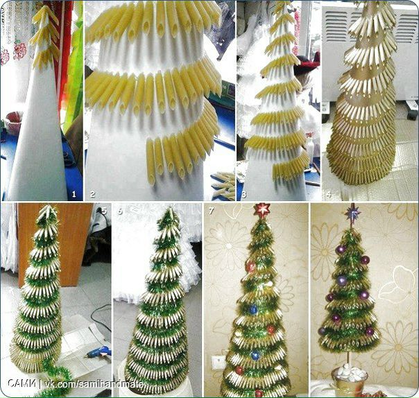 - Новогодние елочки. Какой новый год без наряженной елки? Вы можете смастерить маленькую елочку из подручных материалов: пробок от бутылок, макаронных изделий, разноцветных вязальных ниток, зеленого фетра. Поделка в виде новогодней елки украсит любую поверхность в доме: журнальный стол, комод, прикроватные тумбочки. Обязательно поставьте несколько маленьких елочек в детскую комнату.