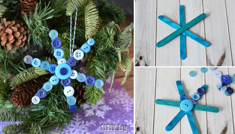 Можно смастерить поделки из дерева для новогоднего праздника. Как известно, символ 2019 года – Желтая Деревянная Свинья, поэтому любые деревянные поделки будут уместны на празднике. Например, из деревянных палочек можно склеить каркас снежинки и приклеить к каждому «лучику» разноцветные пуговицы. Необычные снежинки украсят новогоднюю елку, а также их можно развесить на стенах в качестве праздничного декора.