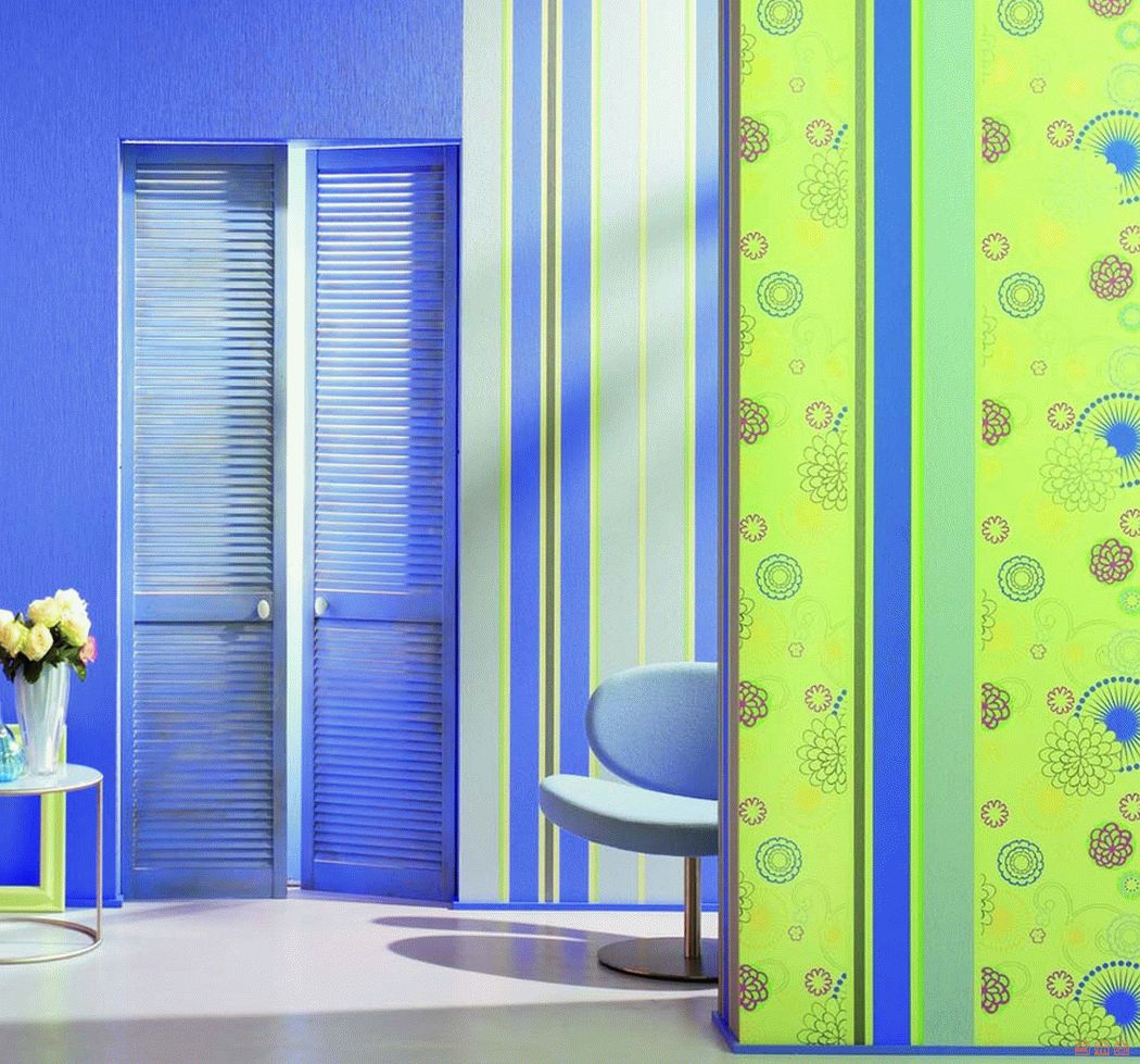 Очень интересным является оформление стен широкими полосами ярких контрастных обоев друг напротив друга.