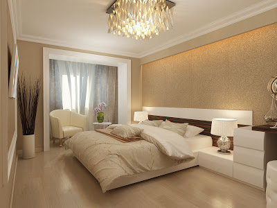 Современная спальня в бежевых тонах с акцентными аксессуарами
