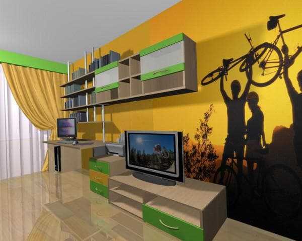 К примеру, если мальчик больше любит играть на гитаре, вы можете её повесить на стену, а сами обои могут быть однотонными или же на противоположной стене могут висеть постеры или фотообои любимой музыкальной группы.