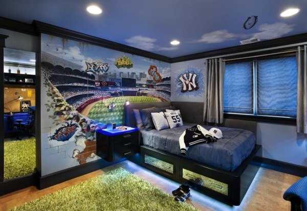 Важно при создании уникального дизайна найти изюминку, которая станет сочным акцентом и будет поддерживать стиль обоев в комнате мальчика подростка, как на фото: