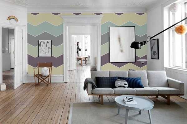 Геометрические фигуры на обоях (круги, квадраты, треугольники, волны, прямые линии) привлекают внимание и задают ритм. Крупный рисунок потребует нейтрального декора: к таким стенам не подойдут шторы с крупными цветами или расшитое покрывало.