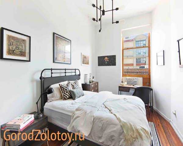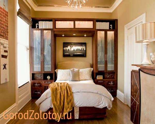 У свободной стены или в нише расположите шкаф-купе, если покупаете каждый предмет мебели отдельно. В наборы для спальни чаще всего входят обычные распашные шкафы. Если в комнате есть компьютер, то не стоит оборудовать отдельное место для телевизора, который будет редко использоваться.