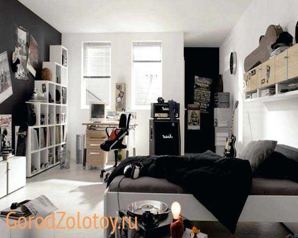 Монохромные цвета при формировании интерьера создают гибкость, поэтому парень в такой комнате сможет повесить картины, фото, музыкальные инструменты и преобразить интерьер. Элементы декора не только придают обстановке изюминку, но и подчеркивают вкус и характер хозяина квартиры.