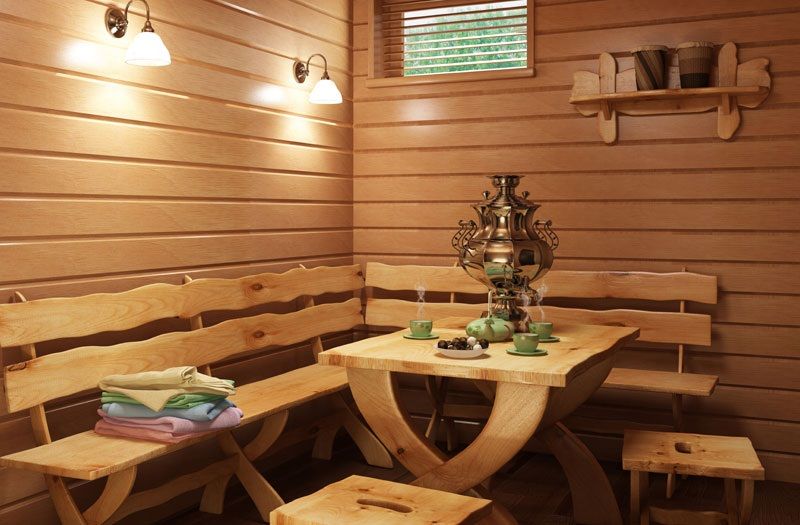 Театр начинается с вешалки, а баня — с предбанника. Здесь не только раздеваются и оставляют одежду, но и отдыхают между принятиями пара, пьют чай или холодный квас за резным деревянным столом с удобными скамейками.