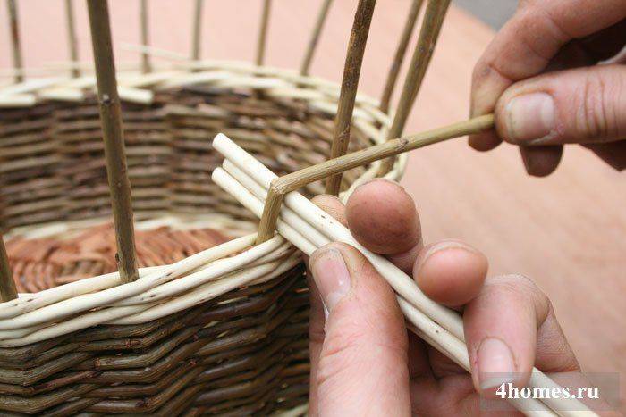 Плетение ручки надо укрепить более толстым прутом, который надо предварительно скрутить, а концы прута надо заострить, чтобы его легко вставить в ряды стенки.