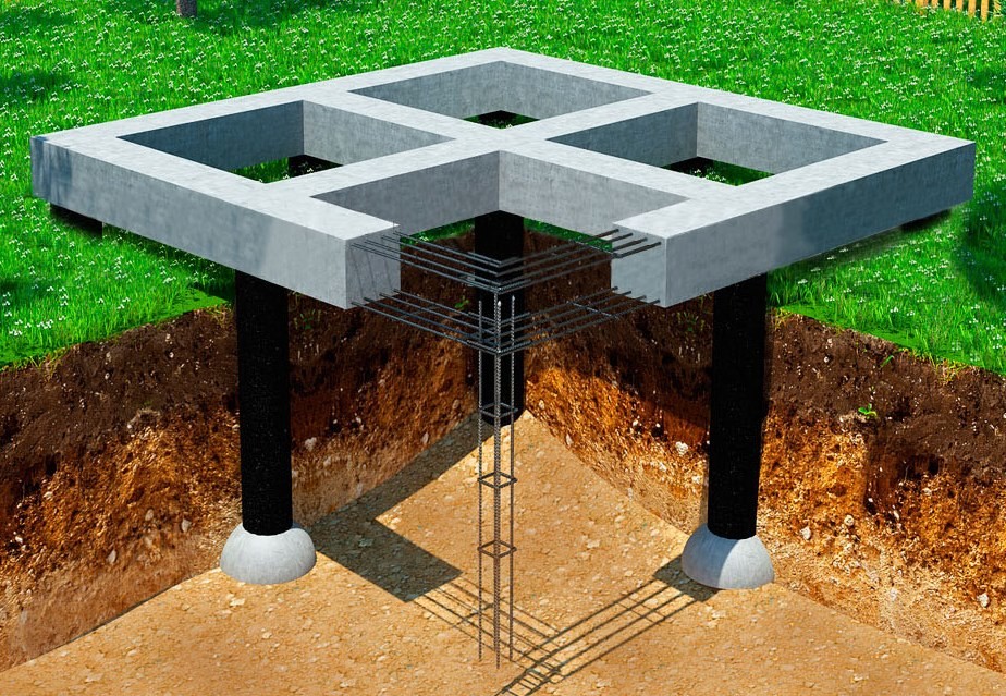 Монолитная плита или ростверк соединяет отдельно стоящие столбы в единую конструкцию. Каждый элемент имеет свое назначение: