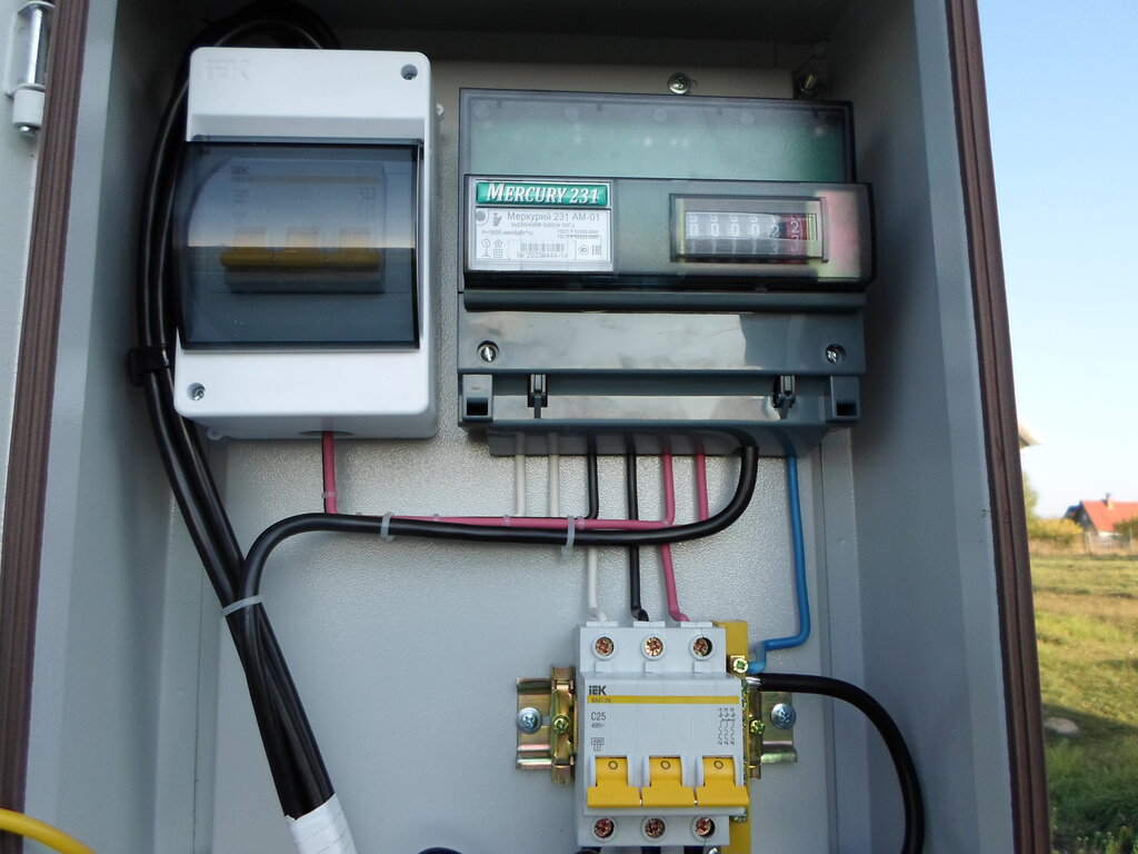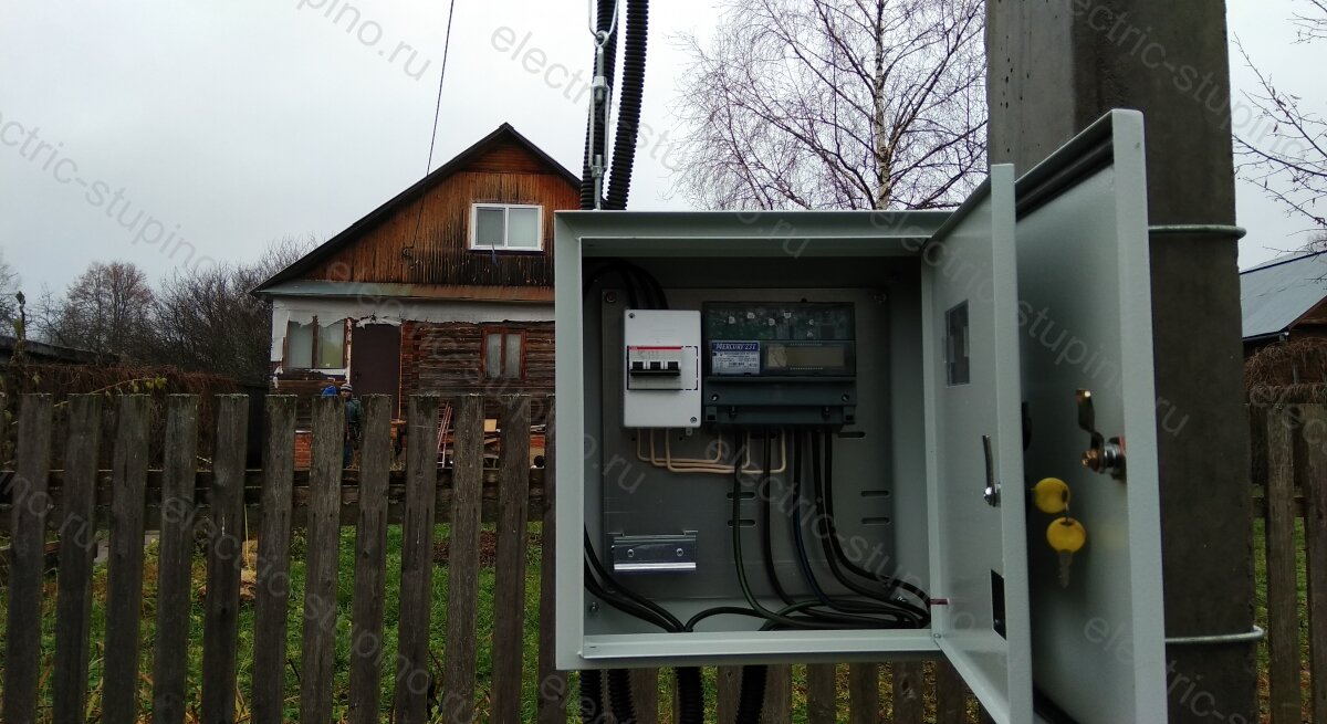 - Подготовить для присоединения энергопринимающее устройство (электроустановку) — а именно щит учета электроэнергии. Его можно устанавливать как на опорах, так и на доме. И, конечно, повесить СИП провод от существующей линии до щита учета. Подключение к линии (прокалывание) при этом не осуществляется, это имеет право делать только представитель сетевой компании!