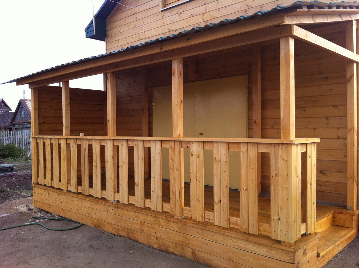 - Возведение по периметру строения. Конструкция имеет общую с баней кровлю, а перила выполняют функцию защитного ограждения.