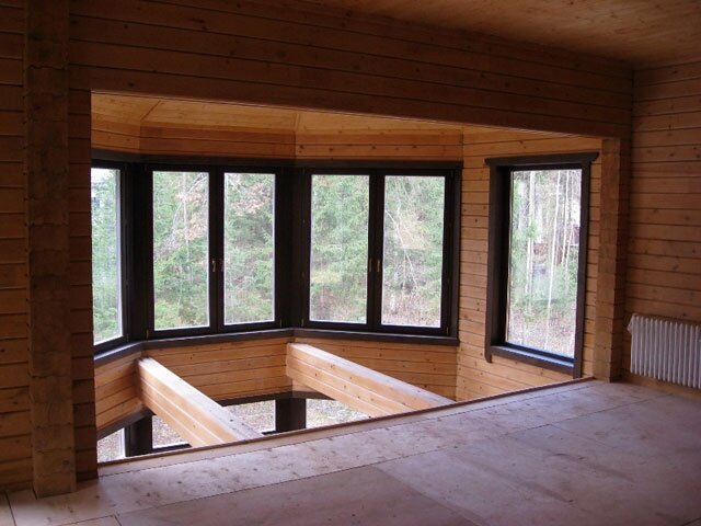 Когда подгонка углов завершена, то далее приступают к крепежу остальных деталей. Венцы эркера накрывают уплотнителем, а уже готовое сооружение конопатят. Все проёмы и вход в эркере вырезают после того как произвели крепёж всех деталей.