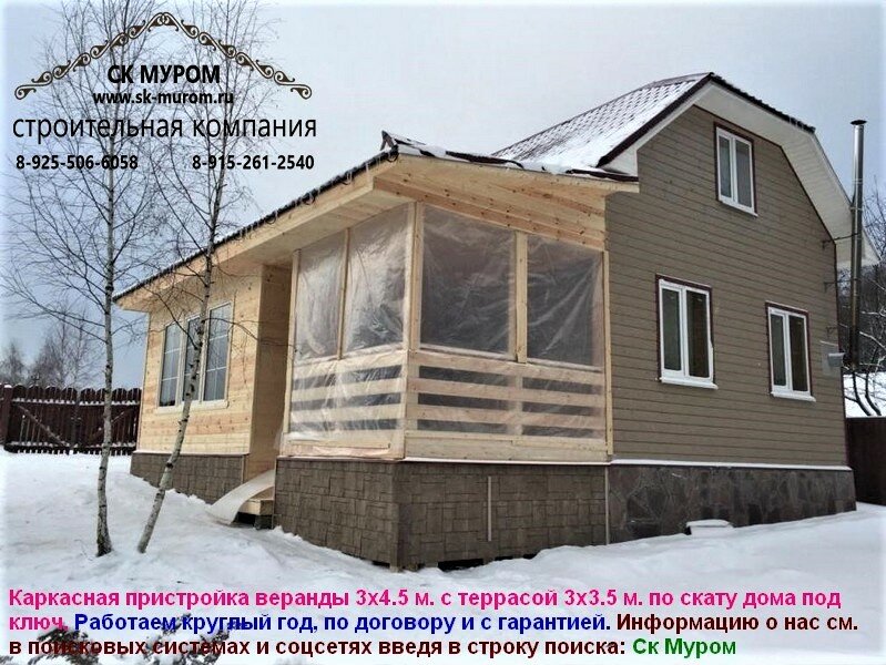 Этот пристрой гораздо проще, чем комната, поскольку его не нужно утеплять и проводить туда коммуникации. Для возведения веранды делают настил, возводят стены и крышу. Следует продумать размеры конструкции, чтобы каркасный дом с террасой или верандой выглядел гармонично.