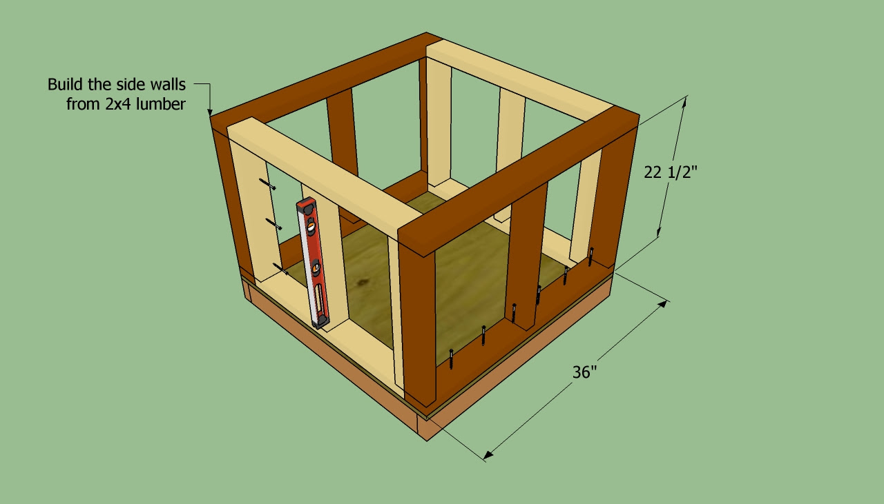 В соответствии с чертежом будки для собаки берутся бруски, каждая сторона которых составляет 40 мм. Они обрезаются по размерам днища. Затем из них складывается прямоугольник на ровной поверхности. Его углы фиксируются при помощи саморезов. Если собака большая, то раму необходимо укрепить. Для этого в ней закрепляются дополнительные перемычки. Затем она, с одной стороны, обшивается досками.