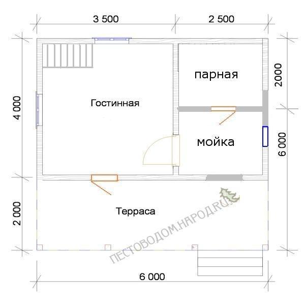 | Углы бани: | Заделываются деревянным плинтусом шириной 6 см. |