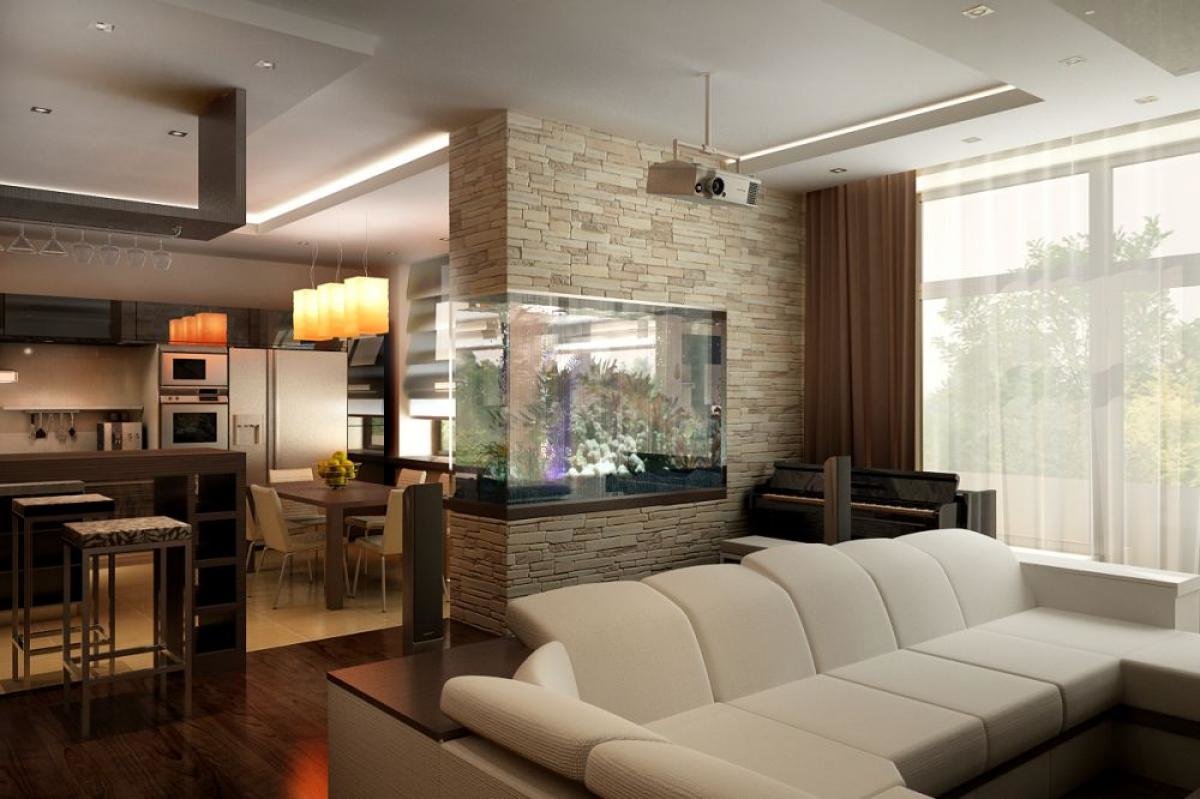 Сочетание гладко оштукатуренных и фактурных стен из кирпича вносит в разработку дизайн проекта квартиры свою динамичность, в то время как применение светодиодной подсветки по потолку способно добавить пространству неповторимую легкость.