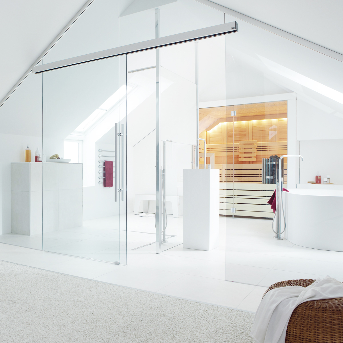 Абсолютная влагоустойчивость позволяет использовать стекло для ограждений и перегородок не только в жилых комнатах квартир и коттеджей, но и в санузлах, например, для организации отдельного пространства для душа или для ограждения ванной, не говоря уже о том, что из стеклянных панелей можно собрать отдельную нестандартную душевую кабину и даже снабдить её откатной стеклянной дверью.